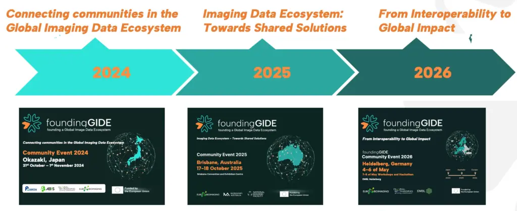 After two successful global community events in Japan (2024) and Australia (2025), foundingGIDE will conclude with its final community event on 4-6 May, 2026 in Heidelberg, Germany followed on 7-8 May by a hackathon and several workshops. This community event will celebrate the project’s achievements in advancing interoperability for biological and preclinical imaging data, bringing together researchers, technology developers, funders, policy makers and industry representatives.